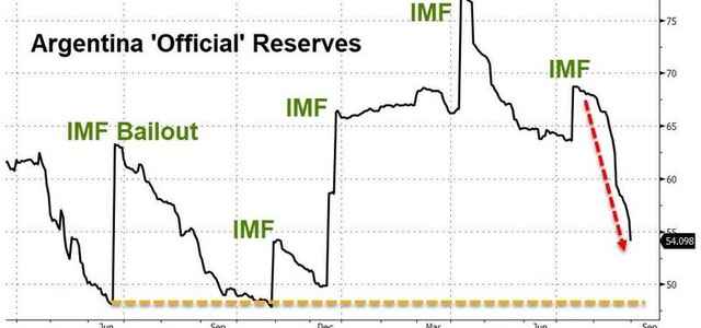 Ci mostra a quanto ammontino le riserve argentine oggi, nonostante 57 miliardi di dollari di prestito dall’Fmi, ottenuti solo un anno fa esatto. Politici incapaci, corruzione, alto debito e inflazione fuori controllo portano sempre e comunque a questo: al default. Perché signori, l’Argentina è già in default un’altra volta. Certo, non potendo Christine Lagarde presentarsi alla Bce a inizio novembre con gli schermi televisivi di mezzo mondo che rimandano immagini di rivolte e assalti alle banche argentine, l’Fmi protrarrà l’agonia e l’eutanasia economica di quel Paese, ma sarà soltanto accanimento terapeutico.