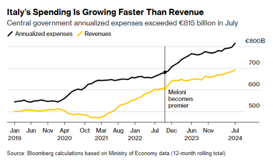 L’appuntamento del 27-28 ottobre, infatti, è dietro l’angolo. I sondaggi in bilico. Quindi, occorreva fare una scelta in nome del tanto peggio, tanto meglio. Guardate per l’ennesima volta questo grafico): pensate che il gap fra calo strutturale delle entrate e debito in continuo aumento divenuto ormai una spirale auto-alimentante si possa invertire o quantomeno rallentare con il bonus bebé, i tagli ai Ministeri tutti da trasformare da parole in fatti o la conferma dell’intervento sul cuneo fiscale? O magari con la mancetta natalizia da 100 euro?