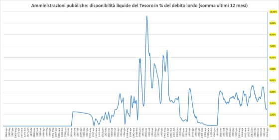 E attenzione, al netto di tempi strettissimi rispetto alla potenziale smentita dei fatti di questa mia ricostruzione (giunta la quale, chiederò scusa e mi cospargerò il capo di cenere), è la realtà contingente e tutta domestica a parlare. Implicitamente. E in controluce. Giorgia Meloni intervenendo sulle cosiddette DTA (imposte differite attive) sta di fatto complicando il dossier Unicredit-Commerzbank. Perché se imponi strutturalmente una norma punitiva rispetto a fusioni e acquisizioni bancarie, proprio mentre il tuo numero uno del credito sta scalando in maniera ostile una concorrente, vuol dire che sei alla frutta con i conti. E questo grafico) ci dice che oggi il livello di liquidità del Tesoro italiano sia sotto la soglia del 2%. Per la precisione all’1,47%. Come nel 2000, 2008 e 2012. Oltretutto, mentre la Germania sta attrezzandosi per resistere.
