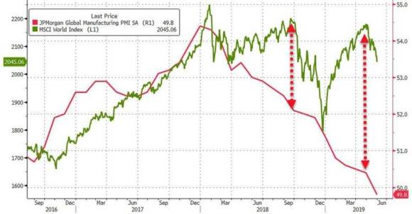 E la Bce? Oggi, probabilmente, scopriremo qualche carta in più, in attesa che l’estate faccia divampare la guerra per la successione a Mario Draghi. C’è poi questo secondo grafico, il quale implicitamente e impietosamente sembra mettere in prospettiva la magnitudo di quanto stimolo monetario servirà per non precipitare in un altro 2008: la linea verde rappresenta l’Msci Global Index, ovvero l’indice benchmark dei mercati azionari mondiali, mentre quella rossa il dato PMI manifatturiero globale tracciato da JP Morgan.