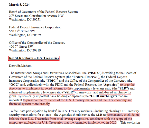 Nel silenzio generale, il 5 marzo la Isda (International Swaps and Derivatives Association) prendeva carta e penna e scriveva a Fed, Fdic e Occ – le cosiddette Agencies – chiedendo l’esclusione permanente delle detenzioni di debito pubblico Usa dalla Slr delle banche, stante la pendente riforma che da quattro anni vede le medesime Agencies accettare calci al barattolo rispetto all’entrata in vigore. Di cosa si tratta? Supplementary Leverage Ratio, normativa che prevede appunto la necessità di includere i Treasuries a bilancio nel calcolo del cosiddetto surcharge delle banche ritenute sistemiche globalmente. Ovvero, buffer al 3% del capitale. E al 5% per le holding bancarie. La ragione della richiesta via missiva? Mantenere la resilienza del mercato del debito Usa, dell’economia statunitense e dell’intero sistema finanziario globale. Forse anche la pace nel mondo. Tradotto, esenzione permanente o le banche smettono di comprare e detenere Treasuries. Col debito pubblico Usa a quota 34 trilioni e in crescita di un trilione ogni 100 giorni, al netto di emissioni col ciclostile.
