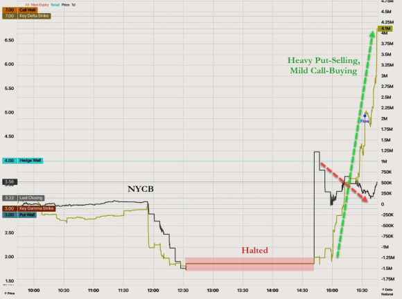 Primo, implicitamente la Fdic rende noto di non aver possibilità di salvare NYCB alle condizioni attuali. Secondo, nessuna grande banca vuole nemmeno sfiorare la cryptonite di NYCB, stante i nomi presenti nel consorzio informale. E la sola Jefferies a orchestrare l’operazione. Terzo, il prezzo del salvataggio non solo appariva decisamente a sconto (meno di 2 dollari per azione), ma non contemplava un’opzione all equity, bensì un mix di equity e convertibili. Insomma, diluizione da svendita e tempi decisamente poco consoni. Quarto, la transazione vedeva come deadline l’11 marzo. Ovvero, altri due giorni di contrattazioni. E, soprattutto, in contemporanea con la scadenza formale del Btfp. Puzza di vulture. Ma se questo non vi pare ancora sufficiente per capire quale sia la reale situazione sotto il pelo dell’acqua di mercato, date un’occhiata a questa immagine.