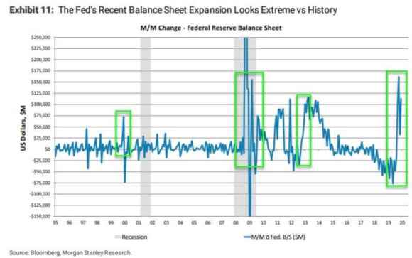 Insomma, il capo della Fed di Dallas ammette due cose, sostanzialmente. Primo, il rally azionario in atto è stato palesemente stimolato – per usare un eufemismo – dall’operatività diretta della Federal Reserve. Secondo, questo comporta rischi e soprattutto un obolo da corrispondere, più o meno nel breve termine. E signori, questo grafico parla decisamente chiaro: la magnitudo dell’intervento già oggi in atto, per quanto Jerome Powell si impegni quotidianamente a ridimensionarla e minimizzarla, è al massimo storico del ciclo post-Lehman.