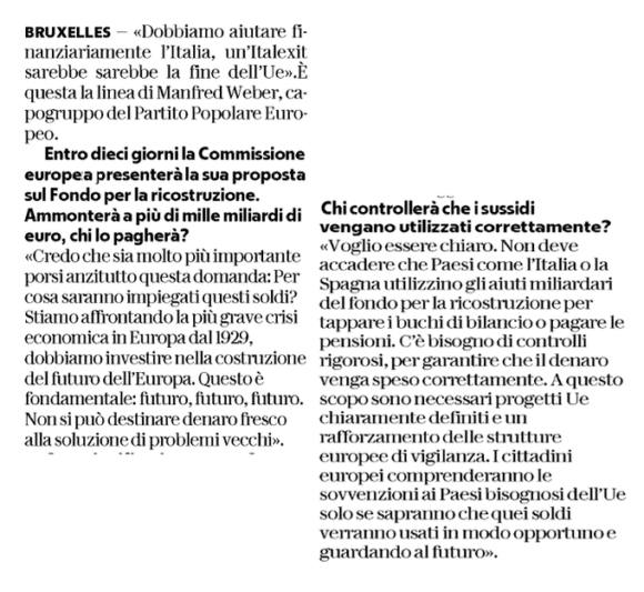 Perché mi dico certo di questo? Guardate questo strappo preso dall’intervista di ieri pubblicata da Repubblica a Manfred Weber, tedesco e capogruppo del Ppe al Parlamento europeo, uno stimato e voluto in quel ruolo anche dall’esponente italiano di quella famiglia politica, ovvero il Cavaliere.