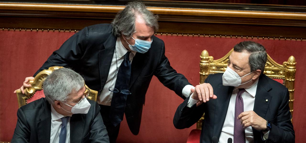 Il premier Draghi con i ministri Franco e Brunetta al Senato (LaPresse)