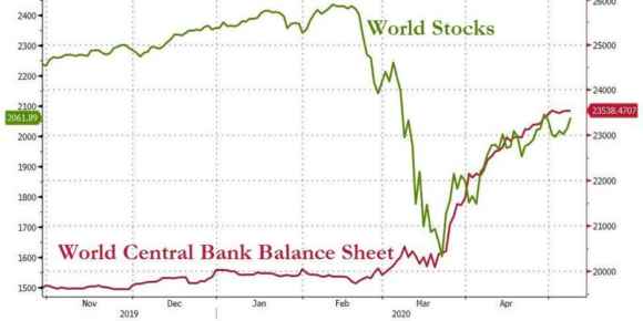 Mettiamo un attimo le questioni in prospettiva, tanto per non perdere la bussola generale su cosa stia accadendo in questo momento in un mondo anestetizzato dalla paura del Covid-19 e dalle conseguenze del lockdown. E facciamolo con questo bel grafico iniziale, il quale ci mostra a quale livello di dipendenza dalle Banche centrali sia arrivato il mercato finanziario. Potrei quasi chiudere qui l’articolo, in realtà, perché quando a governare il cosiddetto sistema ci sono dinamiche simili, appare quasi ridicolo perdersi a polemizzare sul Decreto Rilancio o su come uscire dall’impasse. La regola generale, quasi un imperativo categorico, è una sola: si stampa. Ma, state certi, il peggio (a livello di monetarismo impazzito) deve ancora venire.