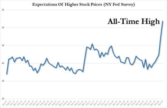 C’è un’unica via di fuga che garantisca un minimo di respiro, prima di decidere se andare o meno in negativo: un crollo del mercato. Esattamente come quello che creò nuovi minimi a metà marzo e garantì alla Federal Reserve mano libera di sfoderare il più grande bazooka espansivo mai messo in campo dal crollo Lehman in poi. Insomma, siamo al paradosso che per tutelare Wall Street, la Fed ha bisogno di farla crollare. Un’altra volta. E con il Nasdaq a +40% in meno di due mesi, quale pensate che sarà il principale candidato per il ruolo di detonatore prima e accelerante poi? Ma soprattutto, se questo grafico ci mostra come il sentiment dei consumatori Usa rispetto alla performance del mercato azionario attesa da qui a un anno – tracciato dalla Fed di New York – oggi sia al massimo storico (per la prima volta sopra quota 50%), a vostro modo di vedere chi resterà ancora una volta con il cerino in mano, dopo essersi indebitato sui debiti pregressi pur di comprare azioni?