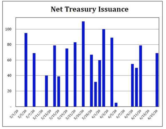 Già, la dinamica cui stiamo assistendo ricorda – per ora in sedicesimi – quella che lo scorso 17 settembre portò all’esplosione del problema sul mercato Repo e che costrinse proprio la Fed a tornare direttamente in campo, dopo un decennio di panchina. Mercoledì, mentre Jerome Powell negava l’ipotesi di tassi negativi, il general collateral era sotto zero. Cosa ha portato a questa nuova tensione sul mercato del finanziamento, stante il diluvio di liquidità immessa nel sistema negli ultimi due mesi e mezzo? Un altrettanto alluvionale drenaggio di liquidità stessa all’orizzonte. Sapete, in ossequio alla necessità di finanziare un deficit ormai completamente fuori controllo, quanti Treasury planeranno sul mercato come tanti Messerschmitt tedeschi nella Seconda guerra mondiale da qui al 15 giugno prossimo, drenando appunto liquidità? Un controvalore pari a 992 miliardi di dollari, come mostra il grafico.