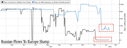 Dopo il vergognoso attacco contro Franco Frattini nella corsa al Quirinale, qualcuno cercherà di sabotare l’evento? Se sì, saboterà il Paese. Meglio saperlo. Perché le cifre non mentono. Il volume di scambio fra Italia e Russia è cresciuto del 54% su base annua fra gennaio e novembre del 2021, raggiungendo la cifra di 27,7 miliardi di dollari. E se la parte del leone è ovviamente appannaggio dell’export energetico russo, le esportazioni italiane verso la Federazione nel medesimo arco di tempo sono cresciute del 20%, raggiungendo gli 11 miliardi di dollari. Ci fanno schifo in tempi di inflazione alle stelle e ormai conclamato sbugiardamento della favoletta del Pil al 6%, totalmente ascrivibile a una colossale una tantum di credito d’imposta chiamato superbonus? Le aziende, quelle vere, stanno morendo per i prezzi dell’energia alle stelle. Ma la politica italiana sembra non interessata, a parte la Lega. E, chiaramente, tutti a puntare il dito sui trascorsi relativi allo scandalo dell’Hotel Metropol. Ma agli imprenditori tutto questo non interessa. E che imprenditori, veri e propri manager di Stato. In compenso, interessa molto la dinamica rappresentata in questo grafico: flussi praticamente a zero attraverso entrambe le pipelines di collegamento verso l’Europa. E Gazprom che non ha prenotato alcuna extra-capacity di trasporto per tutto il mese di febbraio.
