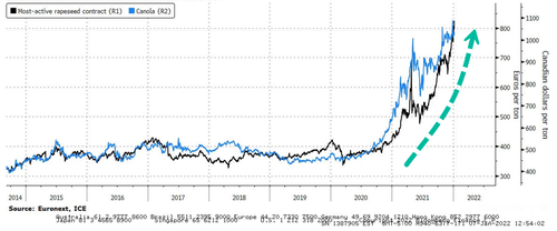 Eppure i mercati hanno reagito come se nulla fosse. Anzi, hanno festeggiato. Certo, il dato record era atteso. Certo, in molti ancora credono alla narrativa della transitorietà. Ma c’è dell’altro. E ce lo mostrano questi grafici: il lumber, il legname da costruzione che la scorsa primavera a operato da canarino (inascoltato) nella miniera, è tornato a salire, così come in continuo aumento è il prezzo degli olii per uso alimentare, sia la colza europea che la canola statunitense. Di fatto, un altro regalo della transizione energetica, visto che gli olii vegetali sono molto richiesti per la produzione di bio-carburante.