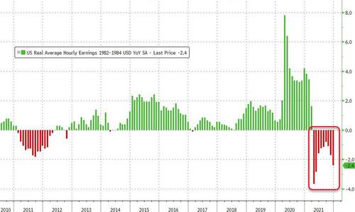 Insomma, un quadro tutt’altro che incoraggiante. Persino per il mercato più ottimista. Anche perché il vero disastro è rappresentato in questo grafico: le dinamiche salariali reali a livello orario negli Usa hanno segnato un -2,4% su base annua, raggiungendo il poco invidiabile filotto di nove cali mensili consecutivi. Insomma, il costo della vita sta grandemente operando in outpacing rispetto agli aumenti nelle retribuzioni reali. E questo dovrebbe spaventare il mercato, quantomeno in un’economia come quella Usa che vede ancora il 70% del Pil basato sui consumi personali. Invece, calma piatta.