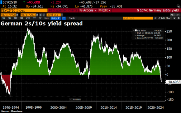 Perché si prezza una Germania in versione colomba, stante il nuovo e più incombente allarme della recessione alle porte. L’inversione proprio sulla curva dei rendimenti dei bond tedeschi – in questo caso fra le scadenze a 2 e 10 anni, il canarino nella miniera del rischio – ha appena raggiunto il suo livello più estremo da 30 anni a questa parte. Tradotto e reso semplice, il premio che il titolo a 2 anni paga rispetto a quello a 10 anni – a fronte di una dinamica che normalmente vede avverarsi il contrario – è tornato ai livelli di inizio anni Novanta. Insomma, il mercato non ritiene più prioritaria la compensazione di rischio sul futuro a lungo termine connaturata nello yield di un decennale. E si focalizza invece sul premio che richiede per detenere debito nel medio termine. Ovvero, da qui a 2 anni. Tradotto ulteriormente, i timori per la recessione in arrivo sono di quelli davvero seri. Ma signori, stiamo parlando della Germania. Traslate questa dinamica all’Italia con le sue criticità storiche e attuali ed ecco spiegato il doppio binario. E persino la differenza di risultato ottenuto a sole 24 ore di distanza l’una dall’altra dalle aste di Bot a 12 mesi e Btp a 7 anni.