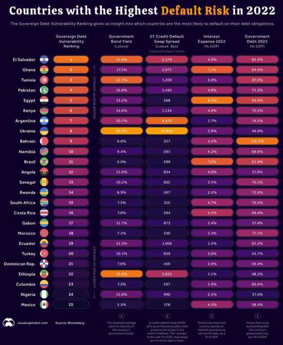 Ancora più interessante è dare un’occhiata a come i mitologici mercati guardano a quanto sta accadendo, perché si sa che sangue chiama dollari e viceversa. Bene, date un’occhiata a questa tabella, la quale ci mostra la classifica delle 25 nazioni più a rischio di default nell’anno in corso. E attenzione, è frutto dell’elaborazione di Bloomberg e si basa su criteri fissi, quali rendimenti medi dei bond governativi, spread del credit default swap a 5 anni, spese per interessi sul debito rispetto al Pil e debito governativo rispetto al Pil.