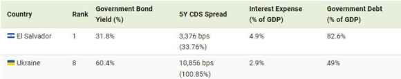 In compenso, all’ottavo posto di quella classifica c’è l’Ucraina. E questa seconda immagine mette plasticamente in prospettiva il livello di ottusità dell’Occidente. Se infatti El Salvador sconta, oltre a numeri poco entusiasmanti a livello macro, il suo status azzardato di Bitcoin nation, Kiev porta in dote una garanzia di default a 5 anni pressoché totale. E la cosa non stupisce, stante solo il debito nei confronti del Fondo monetario internazionale.