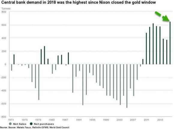 E il Cremlino ha fatto anche altro, infatti, come mostrano questi grafici, ovvero, comprato – esattamente come ha fatto la Cina – oro fisico con il badile negli ultimi anni per diversificare e de-dollarizzare le proprie riserve, creando quello che viene definito un safety buffer, un cuscinetto di sicurezza dalla crisi economica. Certo, alla gente non puoi dare lingotti da mangiare ma, come mostra il secondo grafico, nel 2018 la domanda di metallo prezioso da parte delle Banche centrali del mondo è stata la più alta da quando Nixon ha detto addio al gold standard. C’è fame d’oro, mai come oggi. E, soprattutto, la scorsa settimana – con decisione che ha sorpreso tutti – la Bce ha comunicato che dalla fine del prossimo mese di settembre cesserà il vincolo sulle vendite di oro da parte delle Banche centrali sancito dal Central Bank Gold Agreement del 1999 e da allora sempre rinnovato con cadenza quinquennale. Insomma, non solo gli Istituti centrali europei potranno vendere (e comprare) oro fisico in loro possesso senza limite ma anche senza coordinamento obbligato con i partner.