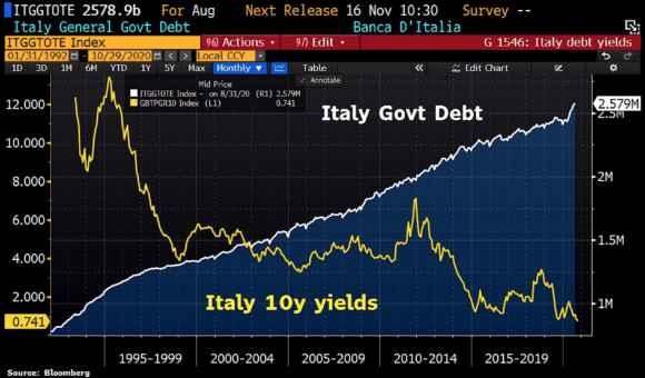 Siamo alla logica di quello che gli anglosassoni definiscono taboo breaker: più la nostra ratio debito/Pil sale verso livelli di insostenibilità strutturale, meno paghiamo per piazzare carta da parati in giro per il mondo. Ora, uno può anche festeggiare questo risultato, ma quanto emerso (anzi, non emerso) dalla riunione del board Bce di ieri ci dice che, nella migliore delle ipotesi, avremo ancora qualche mese in più di relativa calma sul fronte del finanziamento. Ma nulla di più. Negli ultimi due giorni, a fronte del backstop dell’Eurotower tornato a salire oltre quota 16 miliardi di acquisti alla settimana, lo spread era risalito. Sia per una richiesta extra di Bund, a fronte della seconda ondata di Covid che spinge verso beni rifugio, sia perché il mercato comincia a buttare sempre più insistentemente un occhio sull’andamento di quel grafico. E comincia a crederci sempre di meno. Come, temo, comincerà ad affidare sempre meno speranze verso una Bce che ieri si è fatta forte, a livello di risposta pavloviana di mercato, della clamorosa sell-off di mercato del giorno precedente, talmente massiva in tutte le asset-classes (svenduti titoli azionari, bond e anche oro) da essere entrata nel novero storico come terzo evento simile in assoluto.