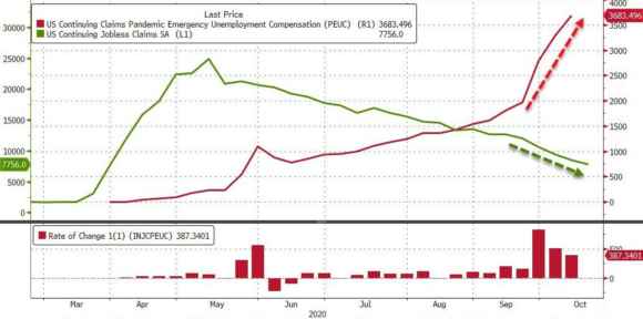 Ora, però, lasciate che abbandoni madame Lagarde e mi spinga proprio oltre l’Atlantico: guardate questo grafico, il quale rappresenta la più plastica dimostrazione di come il dato record del Pil statunitense del terzo trimestre (+33%) sia credibile quanto un Dpcm del Governo Conte.