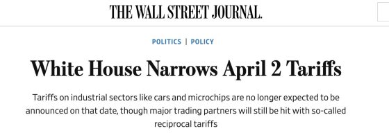 Mentre la macchina della narrazione ansiogena cominciava a scandire il suo conto alla rovescia verso la data di introduzione dei dazi, ovvero quel 2 aprile spacciato al mondo come figliastro dell’Armageddon, ecco a voi l’apertura del sito del Wall Street Journal di ieri mattina. Giusto in tempo per spedire in verde tutti i futures di Wall Street.