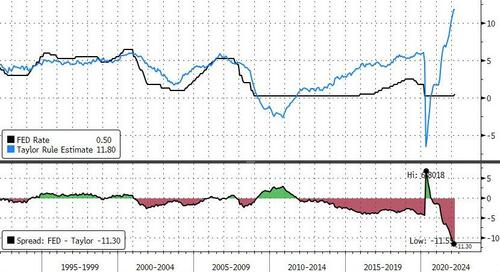 E attenzione, perché questo ultimo grafico è altrettanto inquietante: in base alla Taylor Rule – ovvero, la regola elaborata nel 1993 dall’economista statunitense J.B. Taylor e che indica come la Banca centrale dovrebbe far variare il tasso di interesse nominale in risposta a shock che provochino lo scostamento del Pil reale e del tasso di inflazione-obiettivo -, oggi la Fed è talmente dietro la curva da necessitare (teoricamente) un aumento di qualcosa come 1.155 punti base per tornare meramente alla normalità, stante il tasso di inflazione e disoccupazione. La follia totale, insomma.