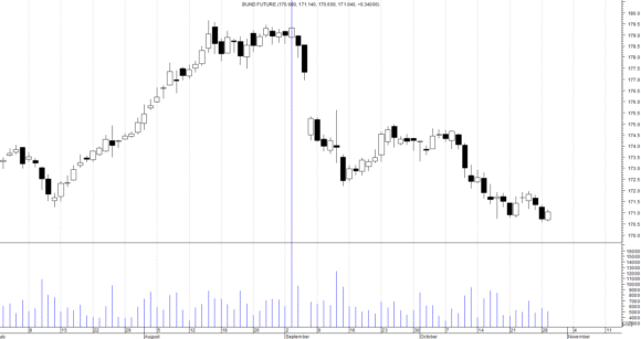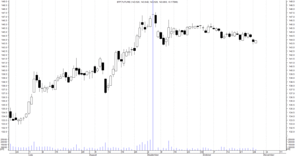 Estendendo l’analisi ai corsi dei singoli futures, si può osservare un’importante divergenza: dai massimi registrati a settembre, il decennale tedesco ha perso quasi cinque punti percentuali passando da quota 179,67 a 171,04 punti; sul versante domestico invece, il nostro Btp, ha “ritracciato” dal precedente 147,70 (massimo del 4 settembre) al recente 147,28. Una vera e propria inezia.