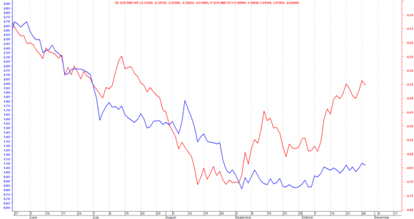 Il valore del famigerato spread tra i due paesi non sembra più essere oggetto di cronaca: i suoi valori (area 140 punti) appaiono imbrigliati in una giornaliera consuetudine. Pochi punti base di differenza con il trascorrere dei giorni: talvolta in su, talvolta in giù. Se con tali impercettibili variazioni mancano gli stimoli di argomentazione, quello che invece deve far pensare sono i rendimenti associati ai titoli decennali. Da settembre (minimo di periodo) a oggi, il titolo a dieci anni tedesco registra un significativo aumento di rendimento: dal -0,703% (3 settembre) all’attuale -0,352%, mentre sul fronte italiano si riportano variazioni in crescita ma di diversa entità: dal +0,812% (4 settembre) all’odierno 1,079%. Sono dinamiche di rendimento che – apparentemente – potrebbero configurarsi come fisiologiche, ossia dettate da assestamenti in funzione delle quotazioni dei singoli sottostanti (Bund e Btp). Ma tali non sono.