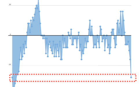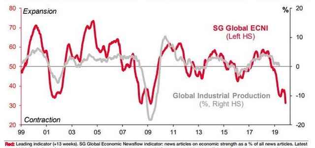 Cosa ci dicono? Si tratta del cosiddetto indice ECNI, ovvero il Newsflow Indicator relativo alle condizioni macro globali. Bene, l’ultima volta che aveva raggiunto questo livello, subito dopo il mercato si è schiantato. È successo prima dello scoppio della bolla dotcom del 2001 e di quella immobiliare del 2008: la riga grigia che, stando alle metriche passate, ora dovrebbe andare in picchiata verso un re-couple al ribasso con quella rossa, rappresenta la tracciatura della produzione industriale nel mondo. Ecco la magnitudo di cosa ci aspetta, con ottime probabilità.