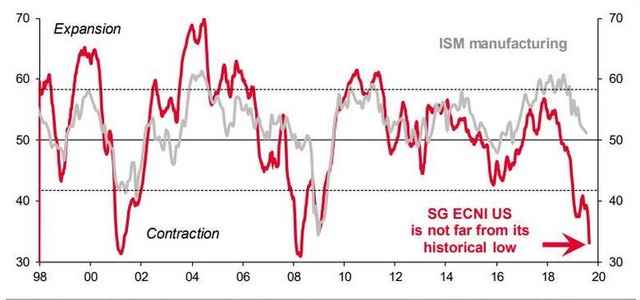 E il secondo grafico è ancora peggiore, perché isola l’industria manifatturiera statunitense come linea grigia, mentre l’ECNI in rosso già oggi non è distante dai suoi minimi record: quanto aspetterà, quanto potrà aspettare Donald Trump prima di intervenire con uno shock vero e proprio, avendo a che fare con una campagna elettorale che sta per entrare nel vivo? E con un euro che già oggi è ai minimi di 1,10 sul dollaro, livello di competitività che fa letteralmente impazzire la Casa Bianca? Quanto attenderà ancora The President prima di mettere in campo l’artiglieria pesante, sia a livello di svalutazione monetaria – su cui può intervenire con poteri speciali in grado di scavalcare anche la Fed, se necessario ed emergenziale – che di coinvolgimento a pieno titolo dell’Ue nella guerra tariffaria in atto, magari cominciando dal comparto automobilistico, che azzopperebbe del tutto la Germania?