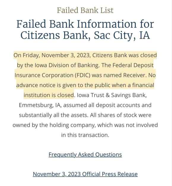 E siamo a sei. Un domino. Una Spoon River silenziosa. Tanto c’è Gaza a occupare l’etere. E poi, i cittadini/correntisti non si accorgeranno di nulla. L’autorità di tutela bancaria dell’Iowa, infatti, ha concordato con quelle federali di assumere il controllo delle due branche di Citizens Bank, inclusi i 66 milioni in assets totali e i 59 milioni in depositi.