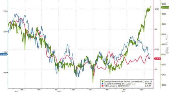 Di fatto, il reverse repo che vede banche e istituzioni finanziarie depositare miliardi e miliardi overnight e ben retribuiti presso la facility della Fed di New York è fonte di di liquidità occulta al Sistema. Si tratta della linea verde. Mentre quella rossa rappresenta le riserve presso la Banca centrale e quella blu la capitalizzazione de mercato azionario Usa. Queste ultime due voci hanno appena visto i loro trend andare finalmente in recouple, dopo un 2023 di pericolosa divaricazione. Il merito? Il Qt e i tassi in rialzo. Tanto Wall Street può contare sul reverse repo, perfetto sostituto del Qe nella lubrificazione di swaps e altri gingilli da Level 3. Quel dormitorio di liquidità federale, di fatto, garantisce al Tga (Treasury General Account) di innescare un circolo vizioso di emissioni rinviate di coupon e minori premi sulla scadenza.