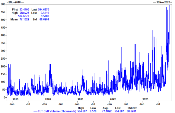 Vuoi vedere che, tempo pochi giorni, salteranno fuori hacker di Hamas o iraniani a giustificare quelle interruzioni? Nel frattempo, altre Citizens Bank potranno fallire senza gloria. Come i bastardi di Tarantino. Sono tempi strani. Pericolosi. Ma anche debitamente silenziati. Ad esempio, il giorno prima dell’infausto epilogo di Citizens Bank, il numero di opzioni call sull’Etf che traccia i Treasuries di lungo termine ha segnato il suo record storico: 595.000 contro una media di 308.496. Ce lo mostra il grafico.