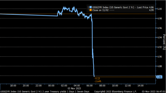 Il giorno dopo, i numeri dell’occupazione Usa hanno messo in un angolo la Fed. E quest’altra immagine mostra quale sia stata la reazione del titolo a 2 anni: un tracollo del rendimento. Immediato. Repentino. A precipizio.