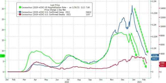 Ce lo mostra questo altro grafico, dal quale si evince la fretta del Congresso Usa – totalmente in mano Democratica, dopo il blitz in Georgia – per chiudere entro il 14 marzo la discussione sul pacchetto di aiuti federali da 1,9 triliardi annunciato proprio da Joe Biden come primo atto della sua amministrazione. Questi sono gli ultimi dati ufficiali relativi a contagi, ospedalizzazioni e decessi in tutti gli Stati Uniti al 30 gennaio scorso: difficile giustificare un programma di stimolo monstre come quello cui si sta lavorando, catalogandolo come anti-pandemico, quando il trend del virus nel Paese è questo. E, almeno stando alla narrativa mainstream, le vaccinazioni procedono a ritmo incessante e spedito (non a caso, Pfizer ha una lunga tradizione pro-Biden, quantomeno a livello di timing degli annunci).