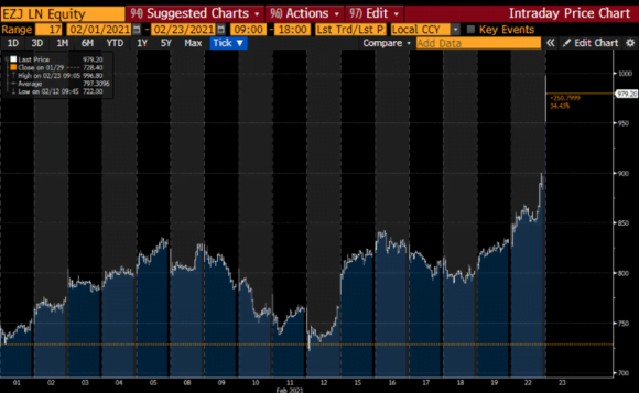 D’altronde, l’allergia latente contro l’Europa filtra anche dal continuo attacco contro la Germania, quasi Berlino stia ancora operando come nel corso del semestre di presidenza. Nulla di più distante dalla realtà: mai come oggi, la Germania sta pensando unicamente a sé. Forse ha dato noia a qualche sovranista sotto copertura il fatto che Mario Draghi abbia telefonato proprio ad Angela Merkel per coordinare una strategia comune di uscita dalla crisi? Vi dirò di più: a occhio e croce, il Premier tiene più in considerazione i pareri della Mutti di quelli di tutti i componenti politici del suo Governo. E anche di quelli dei membri del CTS. E fa bene. Benissimo. Perché signori, se c’è un proxy dell’azzardo che la Gran Bretagna in cerca d’autore sta mettendo in atto in questo momento storico, il quale necessiterebbe invece di buonsenso, è quello che ci mostra questo grafico: si tratta dell’andamento del titolo – al 23 febbraio scorso – della linea aerea low-cost britannica Easyjet, quella che ha monopolizzato il terminal 2 di Malpensa negli ultimi anni. Quella con i vettori arancioni, per capirci intuitivamente.