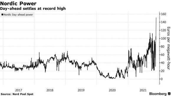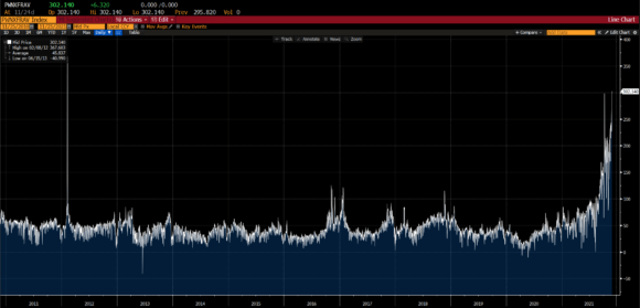 Anzi, non proprio. Questi due grafici mostrano in quale contesto macro sta arrivando questa nuova ondata: il costo energetico in Europa è alle stelle, sia nei Paesi del Nord che scontano prezzi record dovuti a freddo intenso e venti debolissimi che rendono pressoché inutile l’apporto dell’eolico (grazie Greta, sentitamente), sia soprattutto in Francia, il cui Presidente ieri ha siglato in pompa magna l’accordo bilaterale di cooperazione con l’Italia, ma che vede il suo Paese fare i conti con prezzi dell’elettricità che nella media a 7 giorni hanno appena toccato qualcosa come 300 euro per megawatt/ora. Per l’esattezza, 302,140 euro. Nella patria del nucleare: immaginate cosa arriverà addosso all’Italia nel primo trimestre del 2022, stante la nostra dipendenza totale dal gas.