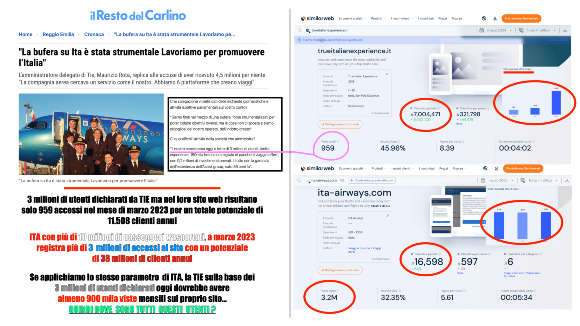 Se analizziamo il sito web di ITA vediamo che gli accessi al sito mensilmente sono più di 3 milioni. Quindi Tie nel periodo in questione ha realizzato lo 0,001% di accessi al proprio sito rispetto a ITA, e quindi la domanda sorge spontanea: ma com’è possibile che dal sito di ITA almeno l’1% e quindi le 106 mila persone che Tie dice di aver portato a ITA non siano andate nel sito di Tie quantomeno per curiosità?