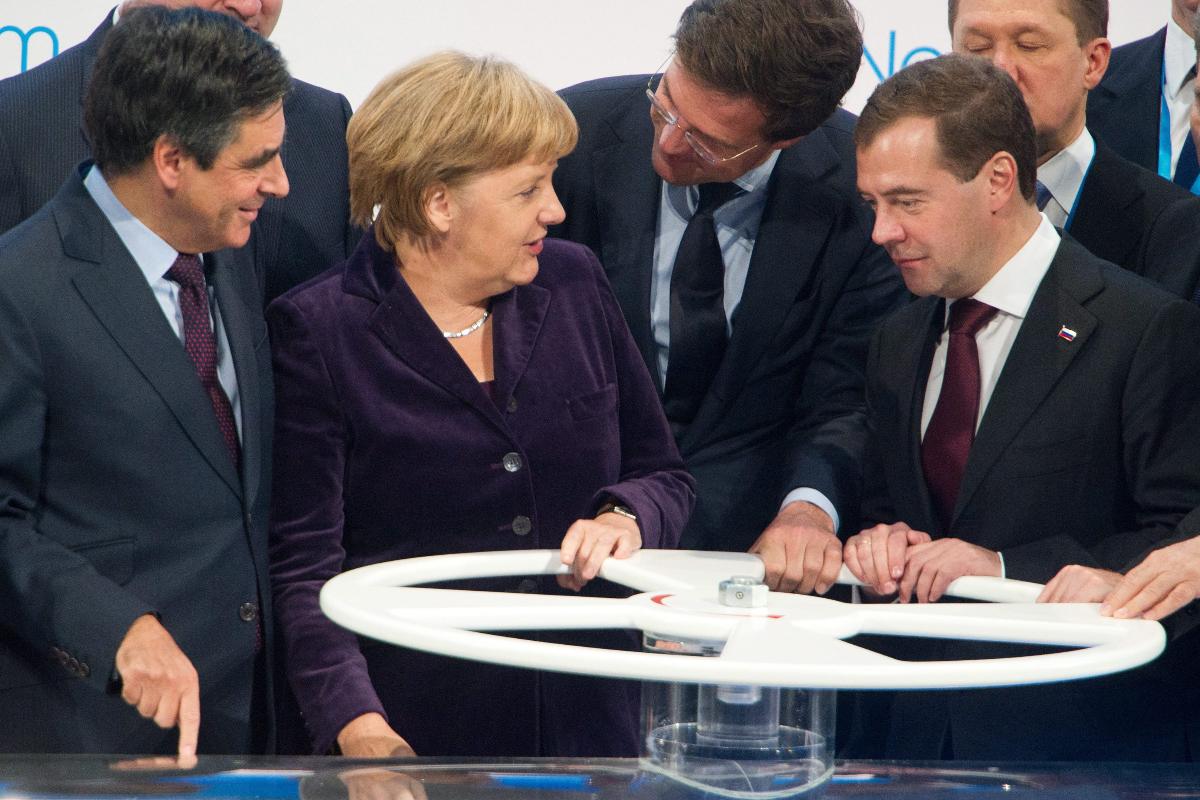 Altri tempi. Intorno alla valvola che inaugura il gasdotto Nord Stream 2, l'8 novembre 2011, si riconoscono François Fillon, Angela Merkel, Mark Rutte e Dmitri Medvedev (Ansa)