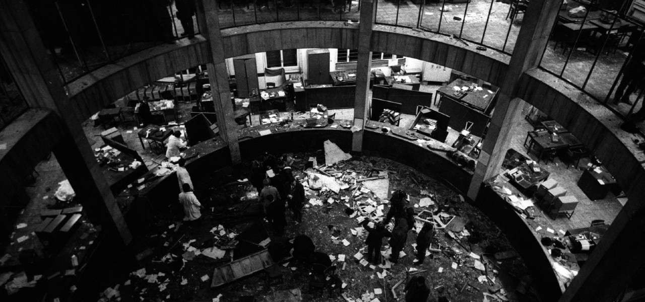 Strage di Piazza Fontana, Milano, 12 dicembre 1969: l'interno della Bna dopo lo scoppio della bomba (foto Wikipedia)