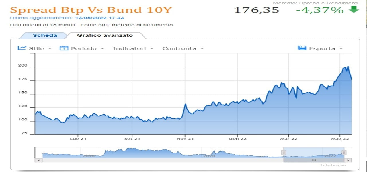 L’apertura è stata di 180,91 punti, contro la chiusura precedente a 184,41. Il minimo giornaliero è fissato a quota 180,91 che corrisponde all’apertura giornaliera. Il massimo di oggi 13 maggio 2022 è fissato a 192,98 punti base. Il minimo annuale resta 128,6 mentre il massimo è quello del 9 maggio 2022 vale a dire 208,41 punti base.