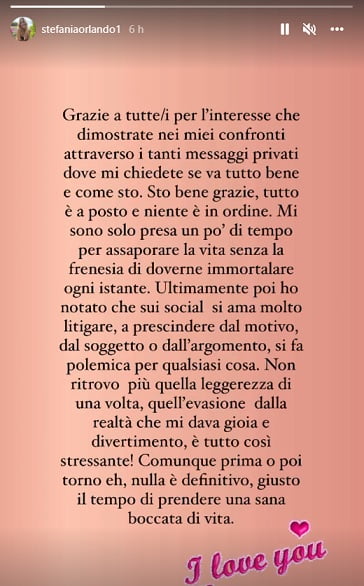 “Grazie a tutte/i per l’interesse che dimostrare nei miei confronti attraverso i tanti messaggi privati dove mi chiedete se va tutto bene e come sto”, ha esordito Stefania Orlando. Dopo aver rassicurato i fan, ha aggiunto: “Tutto è a posto e niente è in ordine. Mi sono solo presa un po’ di tempo per assaporare la vita senza la frenesia di doverne immortalare ogni istante”.