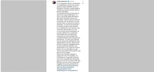 Lo sfogo di Stefano Bettarini contro Signorini continua in modo durissimo. “Tu che a più riprese mi hai attaccato dall’alto di una telecamera e senza mai darmi diritto di replica, atteggiamento di una bassezza infinita, ma d’altronde lo so, ti piace vincere facile. Ci si confronta con gli stessi strumenti. Ma questo vale per chi ha le palle”, dice ancora l’ex calciatore.