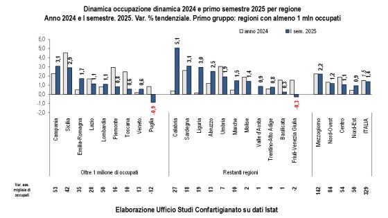 Nel primo semestre 2025 l’occupazione in Italia sale dell’1,4%, con il traino dato della crescita del 2,2% del Mezzogiorno, doppia rispetto all’1,1% del Centro-Nord, con Campania (+3,1%) e Sicilia (+2,9%) a fare da locomotive. Peggiorano le previsioni di assunzione, che per il trimestre settembre-novembre 2025 sono in calo del 2,1%.