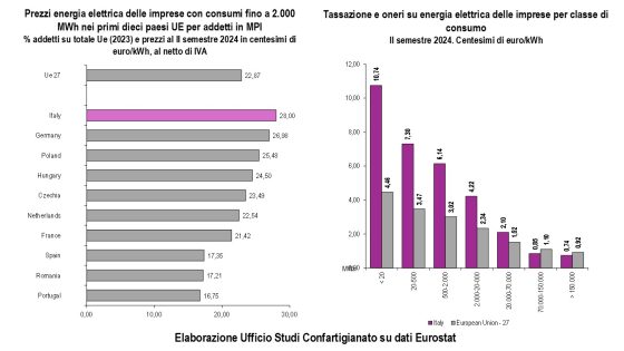Le incertezze e le tensioni geopolitiche mantengono elevata la pressione dei prezzi dell’energia. Per le micro e piccole imprese persiste uno spread sui prezzi dell’elettricità del 22,5% della media dell’Ue a 27, su cui grava lo squilibrio del prelievo fiscale e parafiscale che è più che doppio (+117,4%) della media europea, mentre i grandi consumatori italiani hanno un significativo vantaggio (-20,5%) rispetto ai competitor europei.