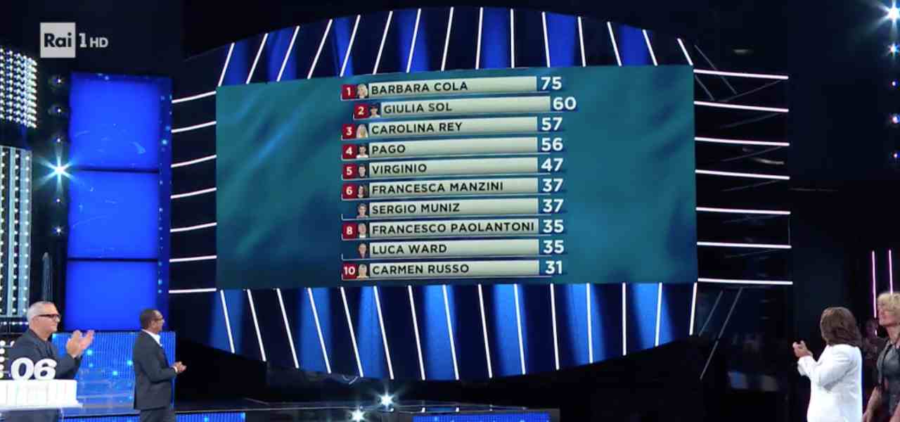 È meritatissima la vittoria di Barbara Cola nei panni di Tina Turner a Tale e Quale Show 2020. In classifica precede la comunque ottima Giulia Sol che si era calata perfettamente nei panni di Whitney Houston. Se i primi due posti sono andati a interpretazioni di artiste di fama mondiale il podio viene completato dall’italianissima Arisa portata sul palcoscenico da Carolina Rey. Seguono Pago e Virginio, che nella scorsa puntata avevano lottato per la vittoria e che oggi hanno interpretato rispettivamente Gianni Morandi e Diodato. Nella parte bassa della classifica troviamo invece Francesca Manzini con Levante, Sergio Muniz con Enrique Iglesias, Francesco Paolantoni con Alan Sorrenti, Luca Ward con Ligabue e una delusissima Carmen Russo nei panni di Sabrina Salerno. (agg. di Matteo Fantozzi)