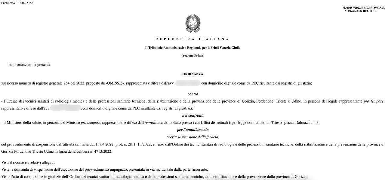 I giudici amministrativi, inoltre, scrivono che l’istanza cautelare della ricorrente va accolta, fermo restando comunque che «la sospensione riprende efficacia automaticamente qualora l’interessato ometta di inviare all’Ordine professionale il certificato di vaccinazione entro e non oltre tre giorni dalla scadenza del […] termine di differimento di cui all’art. 44, comma 5, d.l. n. 44 del 2021», come declinato appunto dalla soprarichiamata circolare. Di conseguenza, il Tribunale amministrativo regionale per il Friuli Venezia Giulia ha accolto la domanda incidentale di sospensione dell’esecuzione dei provvedimenti impugnati e fissato, per la discussione del ricorso nel merito l’udienza pubblica del 23 novembre 2022.