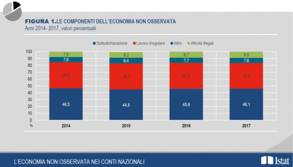Come si legge nello stesso documento redatto dall’Istituto nazionale di statistica, l’economia non osservata rappresenta «la parte di attività economica di mercato che, per motivi diversi, sfugge all’osservazione diretta della statistica ufficiale e pone problemi particolari nella misurazione statistica. Essa comprende, essenzialmente, l’economia sommersa e quella illegale. Le principali componenti dell’economia sommersa sono costituite dal valore aggiunto occultato tramite comunicazioni volutamente errate del fatturato e/o dei costi (sotto-dichiarazione del valore aggiunto), o generato mediante l’utilizzo di input di lavoro irregolare. Ad esso si aggiunge il valore dei fitti in nero, delle mance e una quota che emerge dalla riconciliazione fra le stime degli aggregati dell’offerta e della domanda. Quest’ultimo tipo di integrazione contiene in sé, in proporzione non identificabile, sia effetti collegabili a fenomeni di carattere puramente statistico, sia fenomeni ascrivibili all’esistenza dell’economia sommersa non completamente colti attraverso la stima da sotto-dichiarazione e da lavoro irregolare».