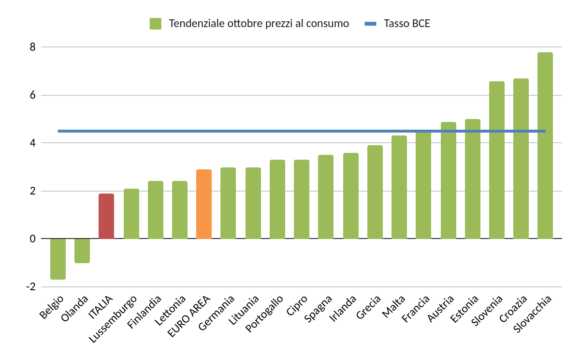 In concomitanza con l’Istat anche tutti gli altri istituti di statistica dei Paesi che adottano l’euro hanno comunicato i loro dati sull’inflazione, permettendo in tal modo all’Eurostat di pubblicare il dato relativo all’intera euro area. Esso vede un tendenziale al 2,9% rispetto al 4,3% del mese precedente, con un miglioramento di 1,4 punti, meno consistente rispetto al calo di tre punti e mezzi che ha caratterizzato l’Italia. Pertanto il nostro Paese, che in settembre aveva un’inflazione maggiore di un punto rispetto all’eurozona, in ottobre si pone esattamente un punto al di sotto, risultando la sua dinamica dei prezzi migliore anche rispetto alle altre maggiori economie europee. Infatti: