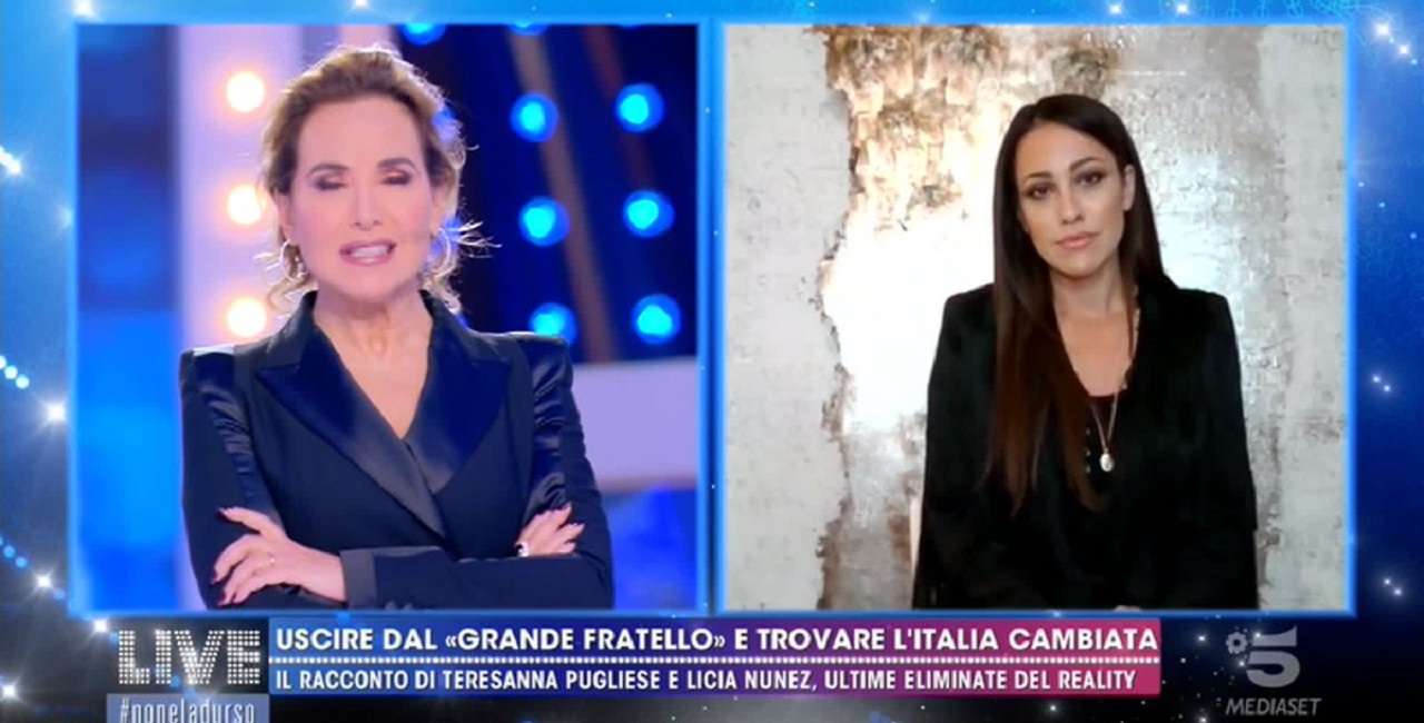 ieri è finalmente tornata in tv per la gioia dei suoi fan. Ad ospitarla non poteva che essere Barbara d’Urso che con il suo Live è riuscita a rimettere insieme la coppia formata dall’ex tronista e da Licia Nunez. L’attrice ha avuto modo di raccontare il suo ritorno alla vita e anche Teresanna Pugliese ha fatto lo stesso partendo da alcuni presupposti diversi rispetto all’attrice. Licia Nunez è entrata all’inizio del programma quando ancora il Coronavirus non era nemmeno all’orizzonte mentre Teresanna Pugliese rivela: “No, in realtà io sono entrata il 17 febbraio quando qualcosa c’era con la coppia di cinesi ricoverati a Roma”. Barbara d’Urso però la interrompe perché quello che le interessa è capire cosa è successo alla sua uscita e come ha trovato il nuovo mondo di cui era informata ma che forse non immaginava in questo modo.