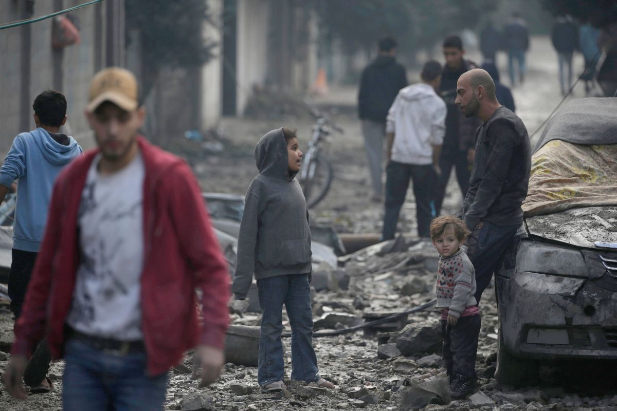 Un padre con in suoi figli nella Stirscia di Gaza dopo un bombardamento israeliano, 25 dicembre 2023 (Ansa)