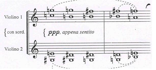 Lo sguardo agli spazi interstellari ci apre dunque un mondo smisurato, familiare (le triadi!) e nel contempo colmo di enigmatico mistero. L’ingresso dei due violini [ 1’03”] (che devono eseguire la loro parte in maniera ritmicamente indipendentemente dal violoncello) impone un’ulteriore tappa all’affascinante cammino appena intrapreso.