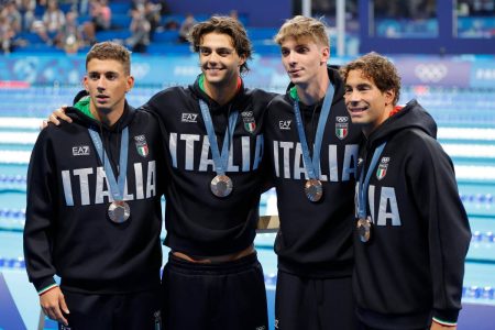 La 4×100 del nuoto maschile con l’argento mondiale (Foto ANSA)
